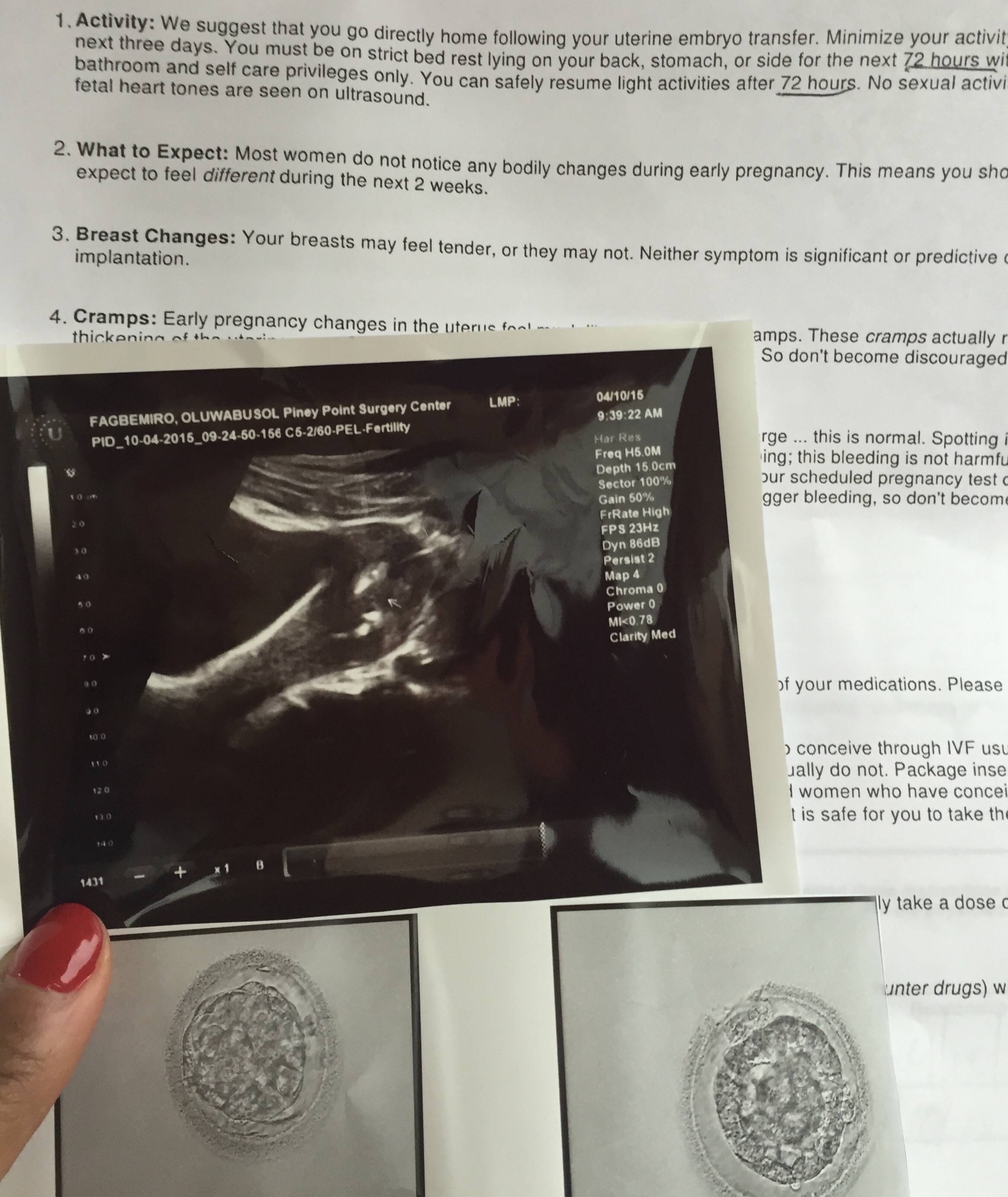 Anyway, after they put the embryo basically in the lining of the uterus, I was on three days of bed rest. During this time, you are off your feet completely except to pee/poop and in my case I just had to shower so I showered while squatting as I thought standing would be bad. The reason so this is even though the embryos are in the uterus you really don’t know if they will implant and start developing into a fetus. So they just want to give your body the best chance to make this happen. I always say, that’s where the science ends cause there are no gaurantees.