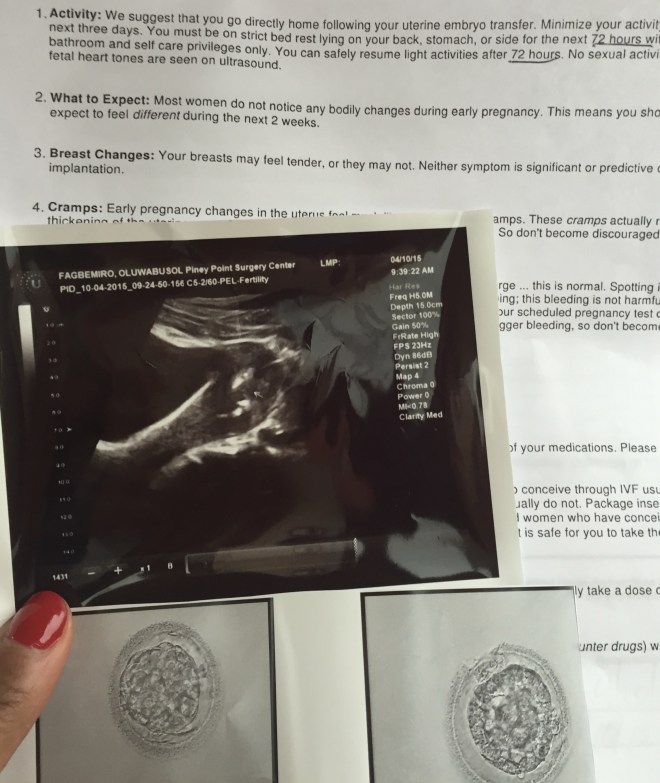 So they take the embryo(s), in my case we decided on two. I was like I might be able to just do this once and have twins and I’ll be good. I also always remembered that bible verse and thought surely “He shall return to me double”.